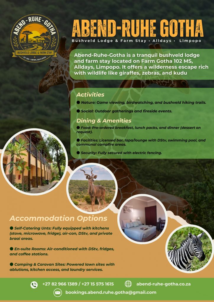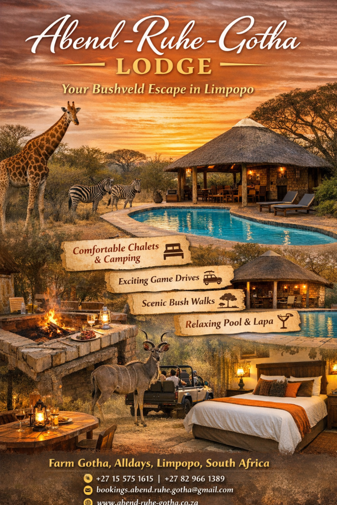 Situated on Farm Gotha near Alldays in Limpopo, this privately managed bush lodge offers guests an immersive escape into nature β far from traffic, noise, and stress. Here, time slows down. The air feels cleaner. The stars shine brighter.