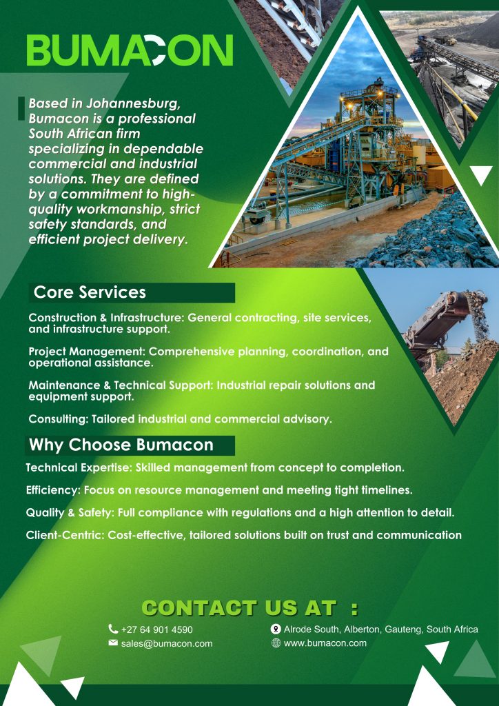 💪 Bumacon is a Johannesburg-based powerhouse specialising in industrial and mining solutions. We are dedicated to boosting operational efficiency, delivering reliable, high-performance services across mining, commercial, and heavy industries. Our goal is to provide practical solutions that reduce downtime, improve productivity, and ensure safety at every stage.