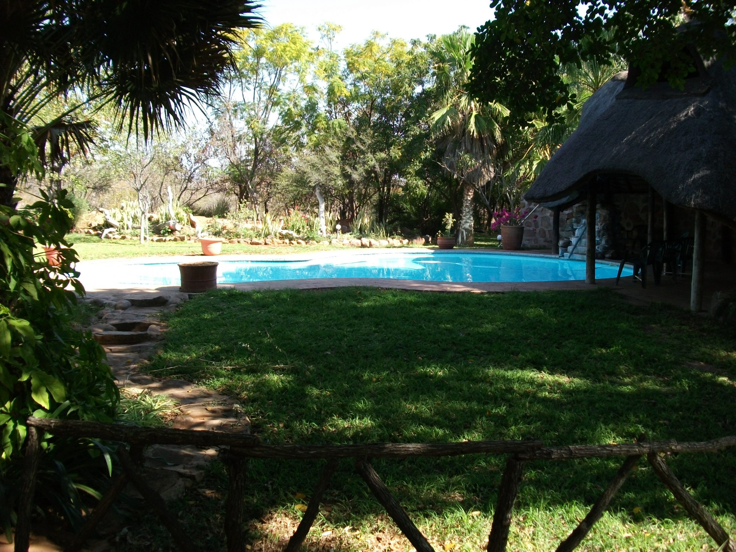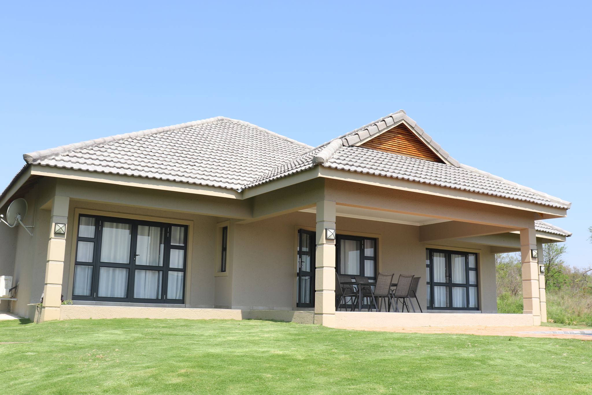 Our Stylish Pool Villa sleeps up to 8 people with ensuite facilities for each room. The Villa has extensive self-catering facilities and large living areas – ideal for groups! Complete with braai area, outdoor seating and a swimming pool. All of our Villas are equipped with DSTV.