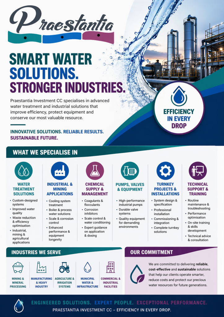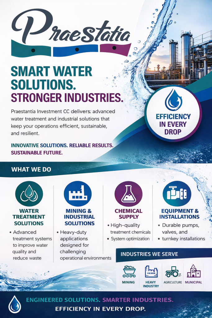 Praestantia Investment CC is a forward-thinking Namibian company specialising in advanced water treatment, industrial solutions, and technical support services. With a strong commitment to sustainability and operational efficiency, the company provides tailored solutions designed to meet the demands of Namibia’s most challenging industrial and environmental conditions.